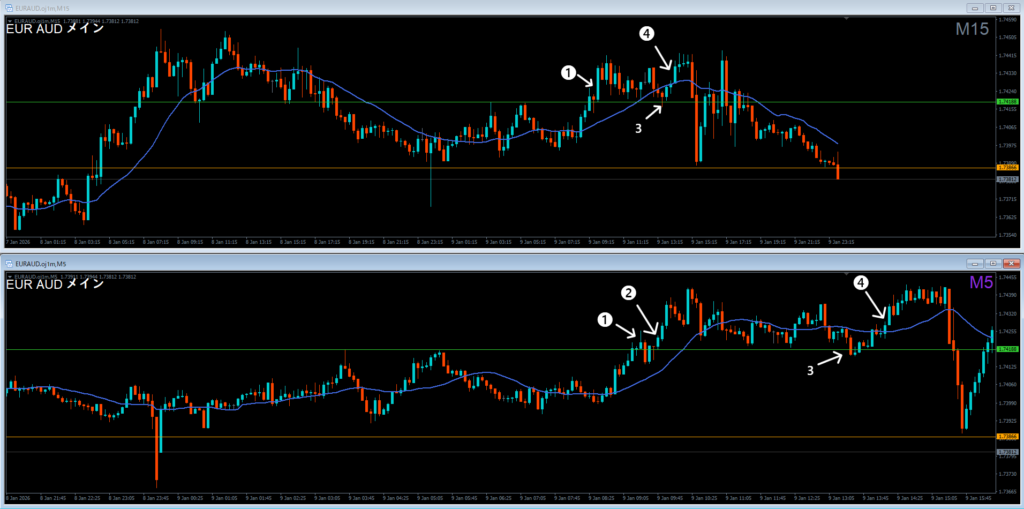 後で見るともう少し待って、❷でエントリが後付けで理想だった。