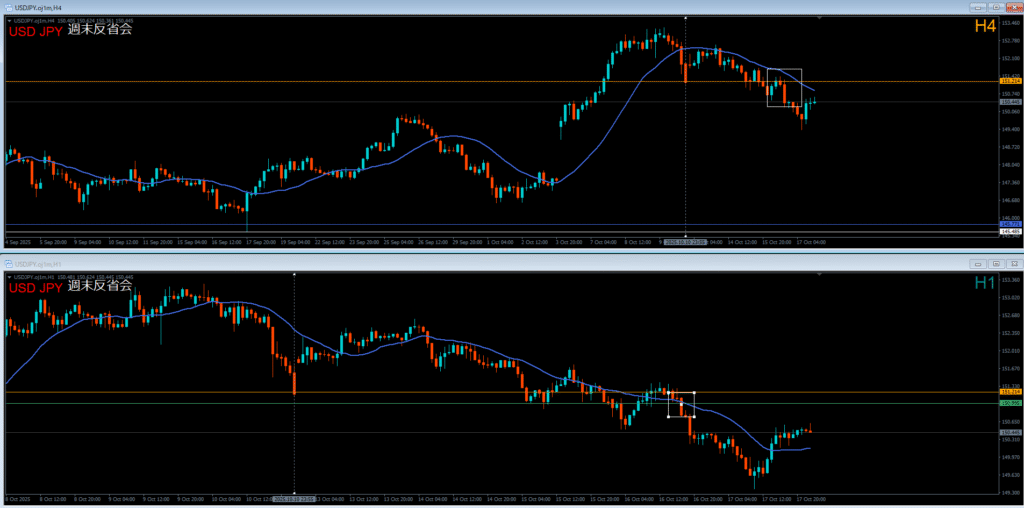 4時間の戻り売りが入りやすい時間帯で1時間で攻防ラインができていないかというところを一応見ていく。