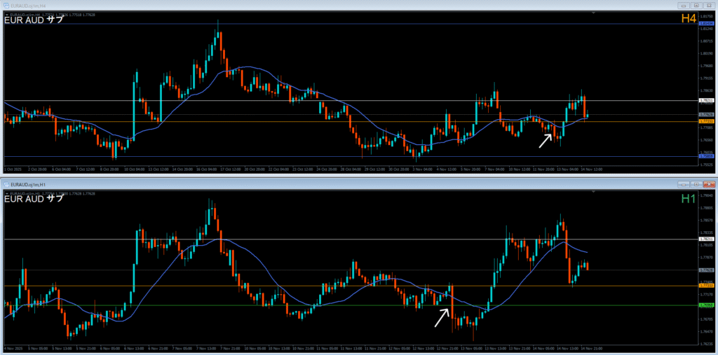 日足の波を狙う4時間のエントリポイントの後の1時間ドコおわで入れる。