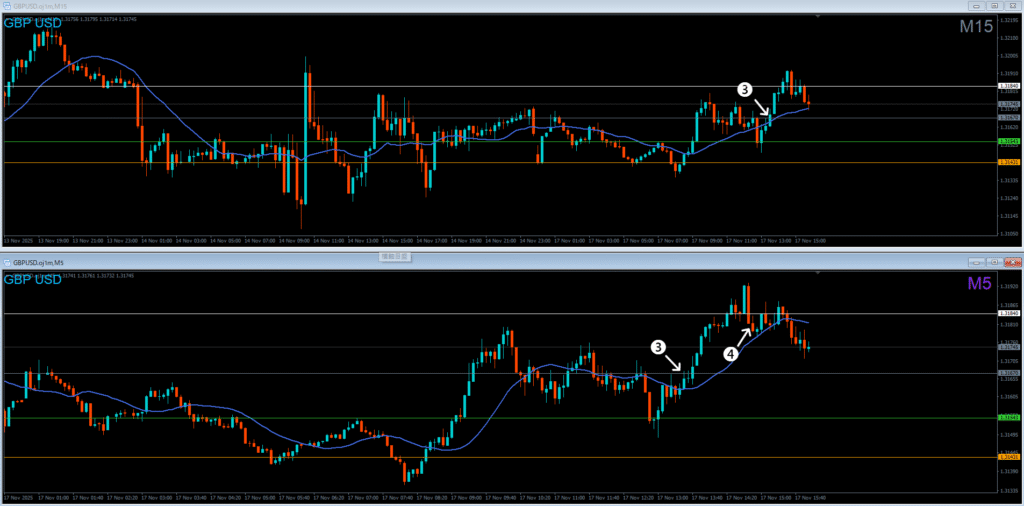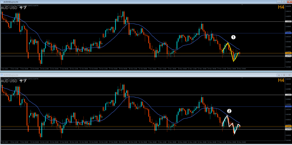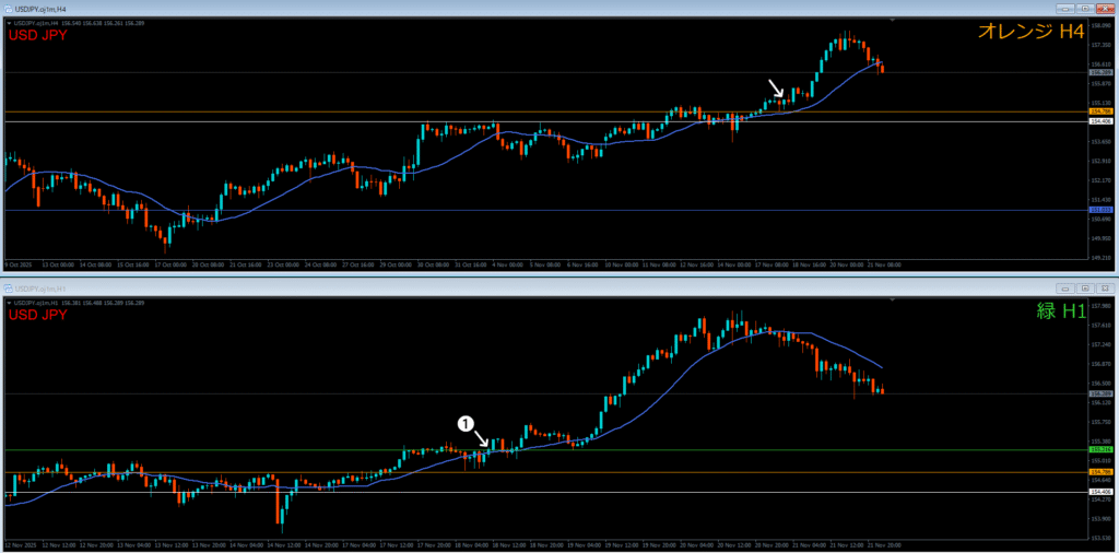 ❷で考えてみると自分がトレードしたポイントは4時間全戻しの押し目買いが入ってくるポイントと考えられる。