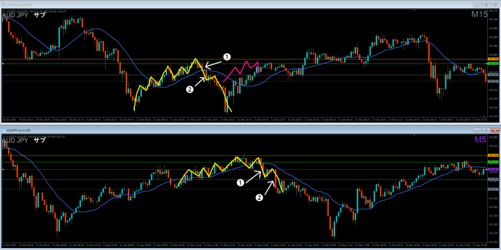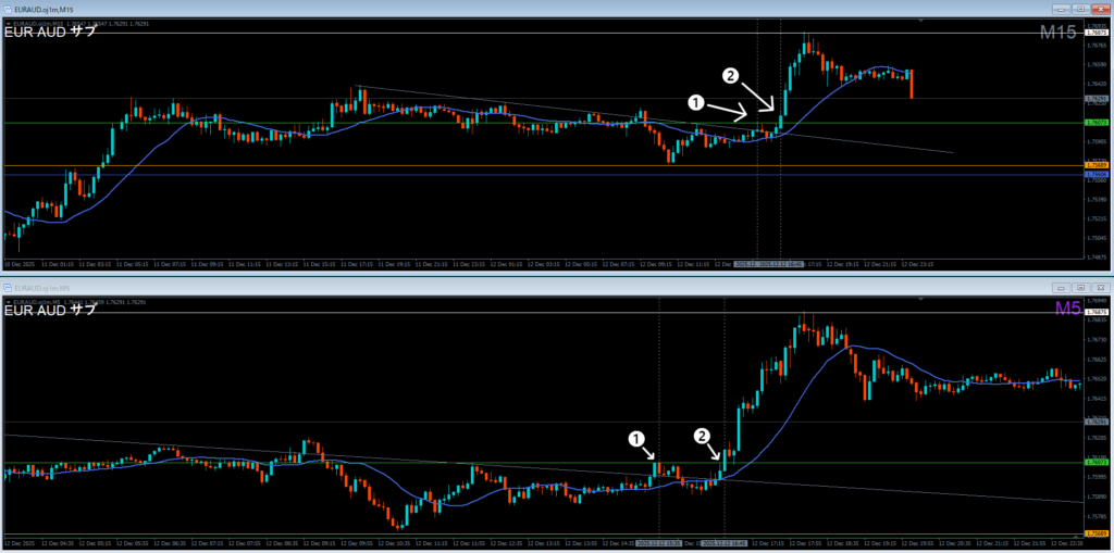 5分足的には❶で入って❷を抜けるか様子見たいが、