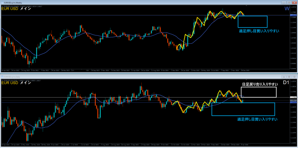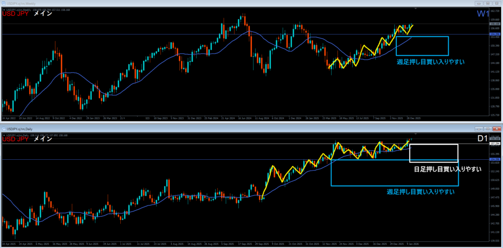 青色の週足サポートラインの下に押し目買い勢力がいる。