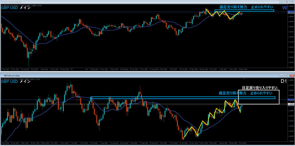 青色の水平ラインの上には週足売り抑え勢力がいる。