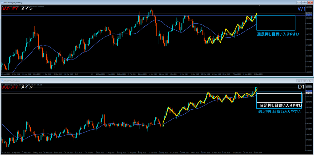 青色の週足サポートラインの下に押し目買い勢力がいる。