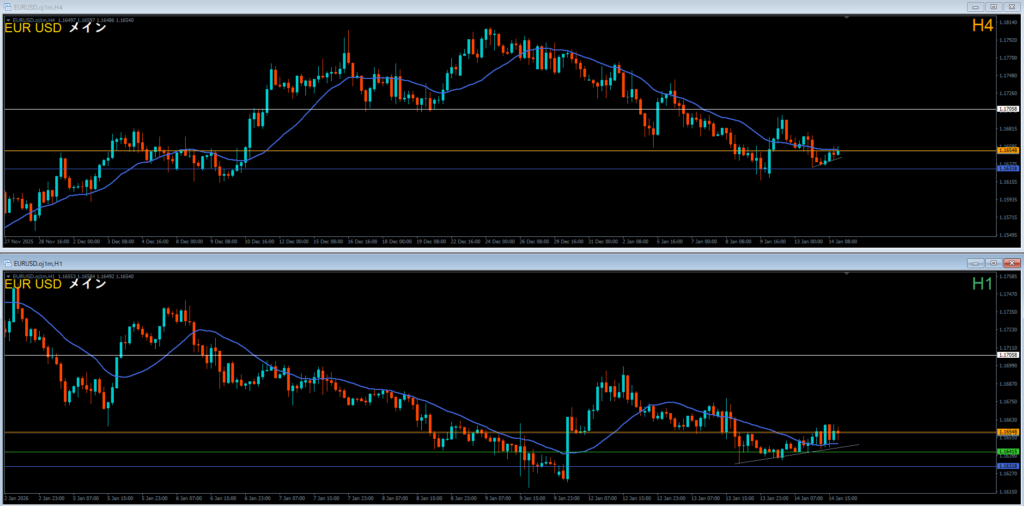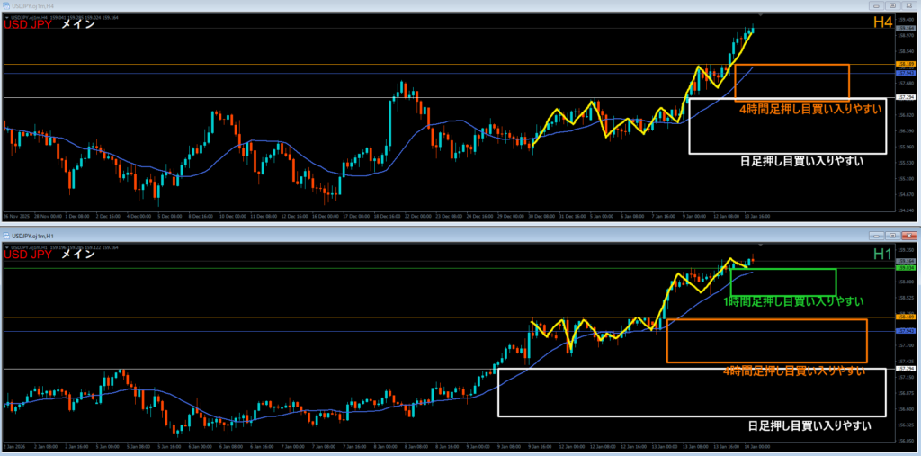 緑色の1時間足サポートラインの下には押し目買い勢力がいる。