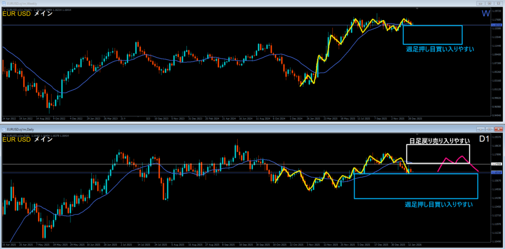 青色の水平ラインの上には週足売り抑え勢力がいる。