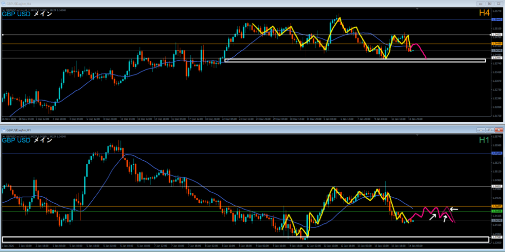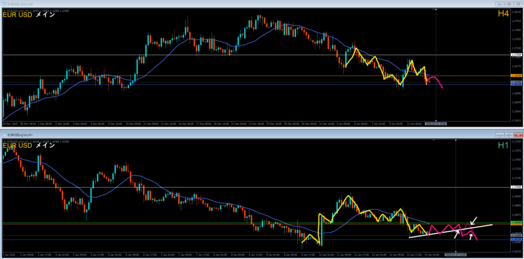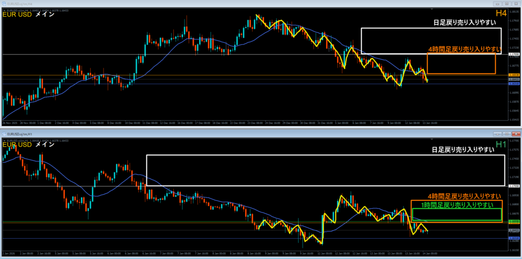 4時間戻り売りの1時間足の動きをシナリオでみていく。