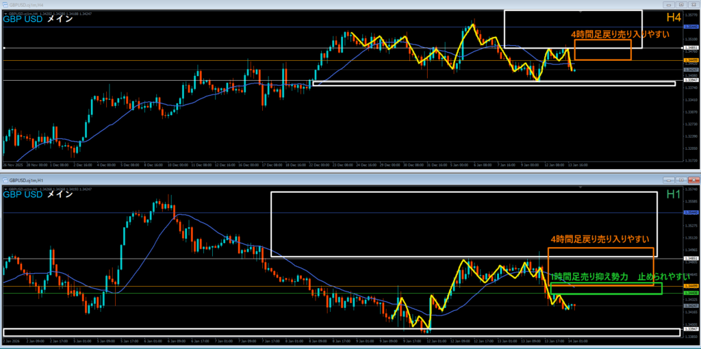 4時間戻り売りはオレンジ色のレジスタンスラインが機能していくかみていく。