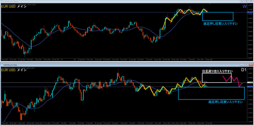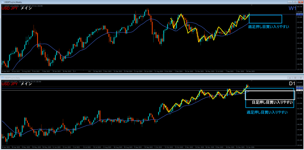 青色の週足サポートラインの下に押し目買い勢力がいる。