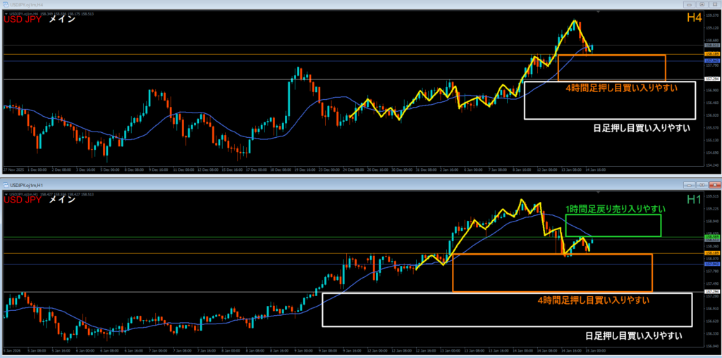 オレンジ色の4時間足サポートラインの下には押し目買い勢力がいる。