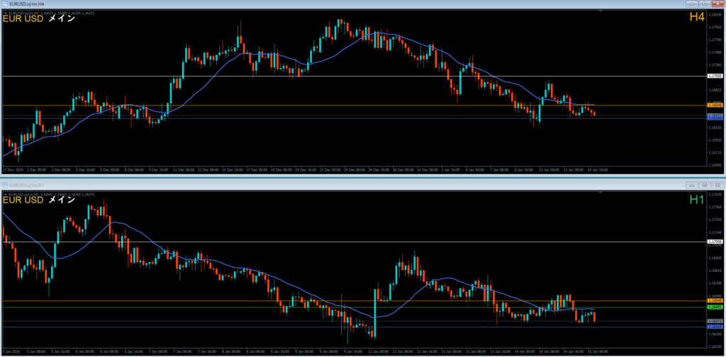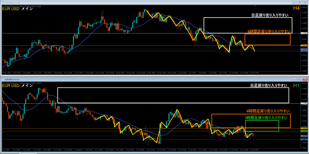 緑色の1時間足レジスタンスラインの上には戻り売り勢力がいる。