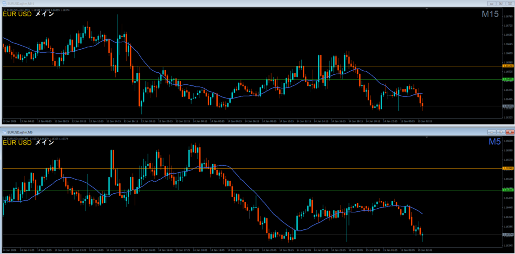 1時間足は安値を割って下落。そこから戻して下落の波の底 or 下落の波の途中。