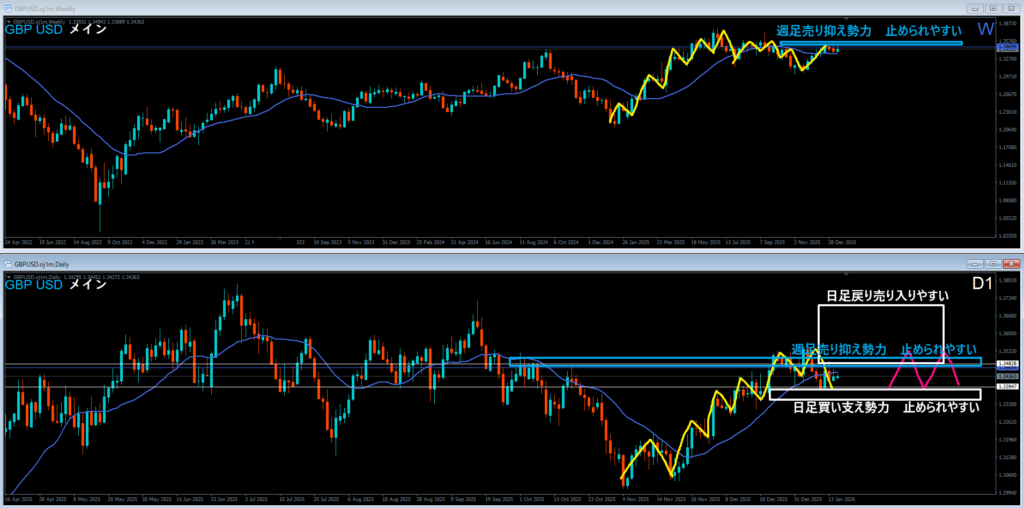 青色の水平ラインの上には週足売り抑え勢力がいる。