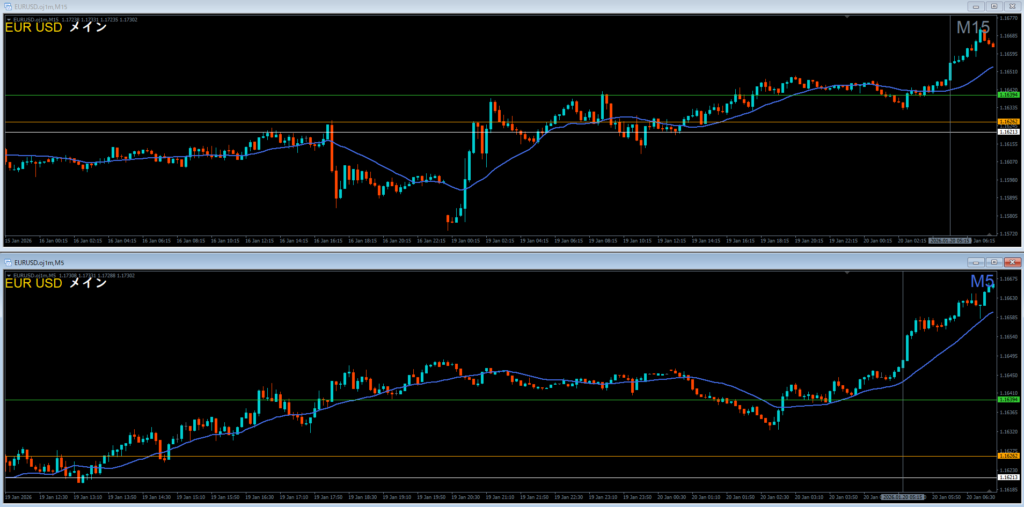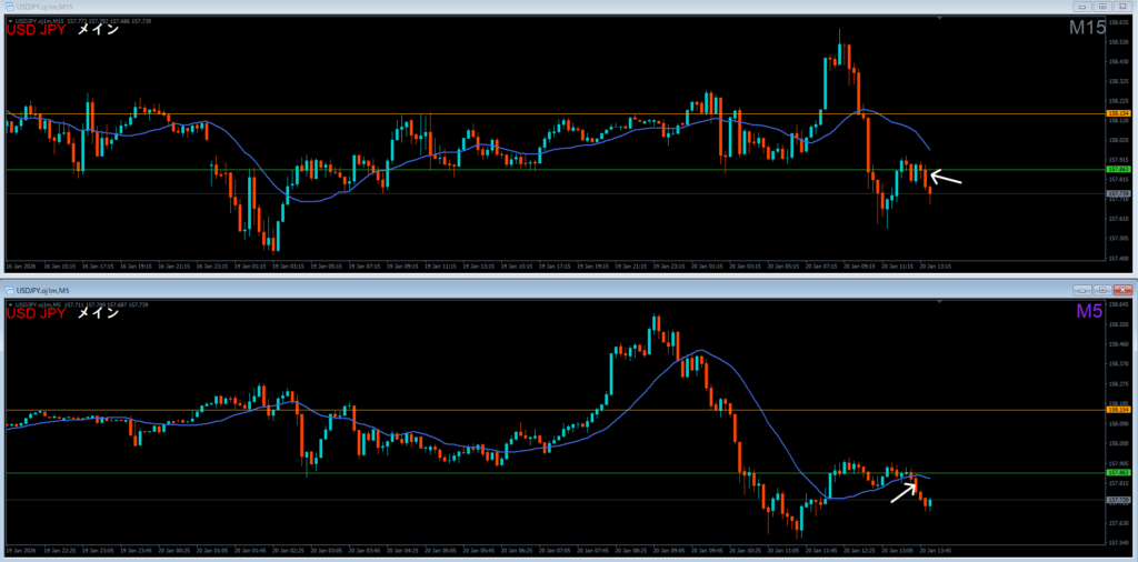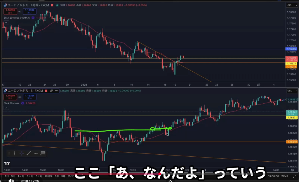 緑色の1時間足サポートラインの下には押し目買い勢力がいる。