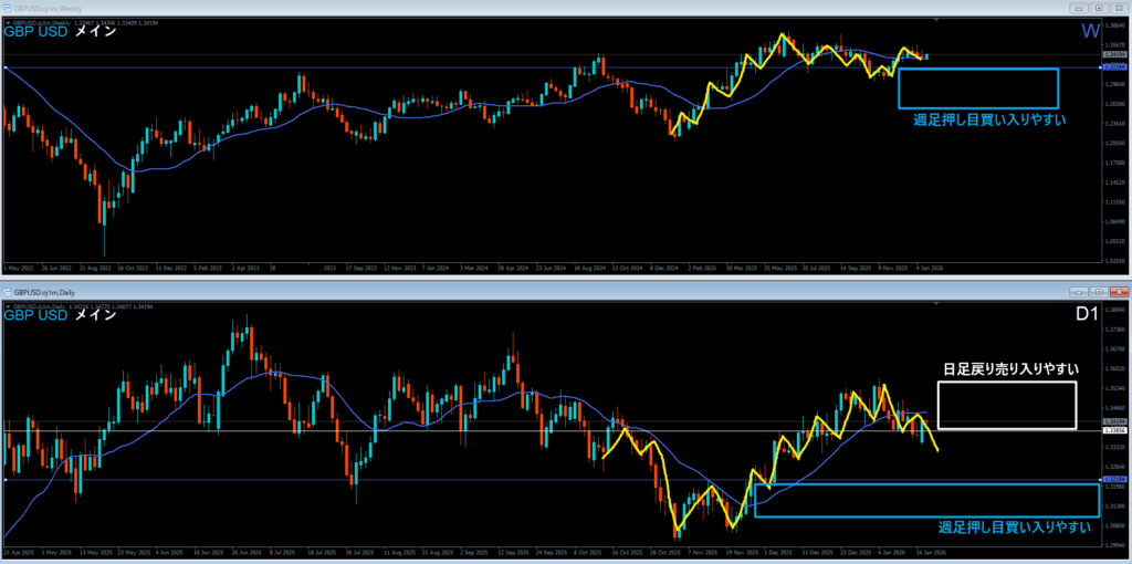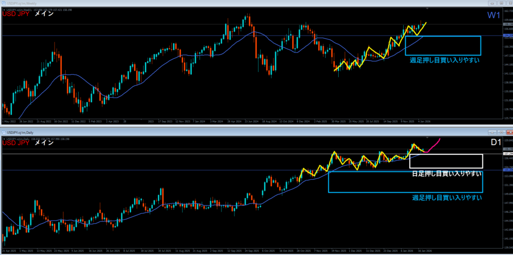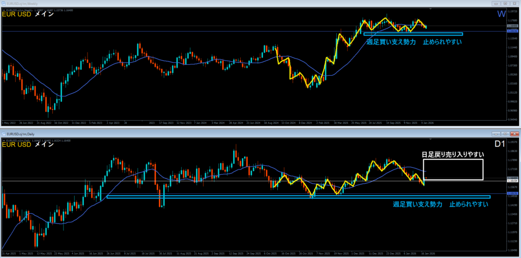 週足は高値を超えて上昇。そこから戻しているエリア。