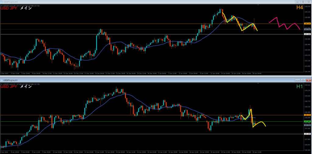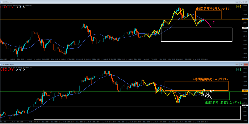 4時間足戻り売りの1時間足の動きをシナリオで見ていく。