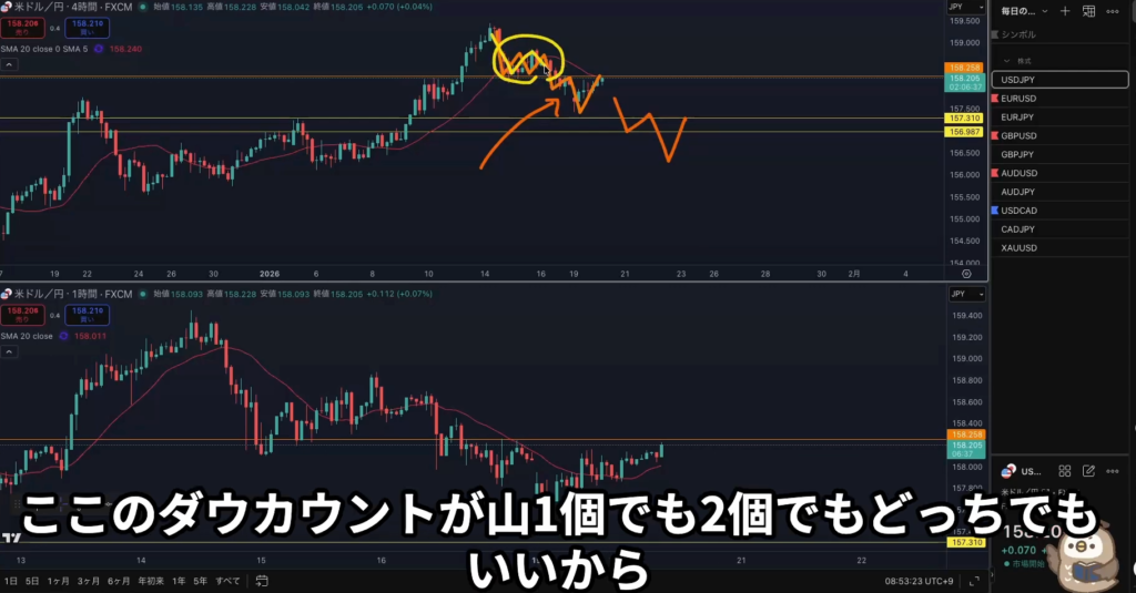 ただ誰がどうみても全戻しのダウカウントではなくて、純粋な4時間戻り売りで見ている勢力もいると判断。3期生は朝の環境認識で4時間戻り売りと全戻し、半分ぐらいの割合だった。
