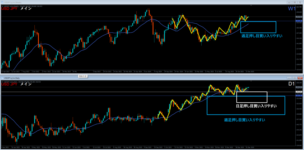 青色の週足サポートラインの下に押し目買い勢力がいる。