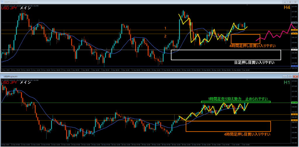 オレンジ色の❷4時間足サポートラインの下には押し目買い勢力がいる。