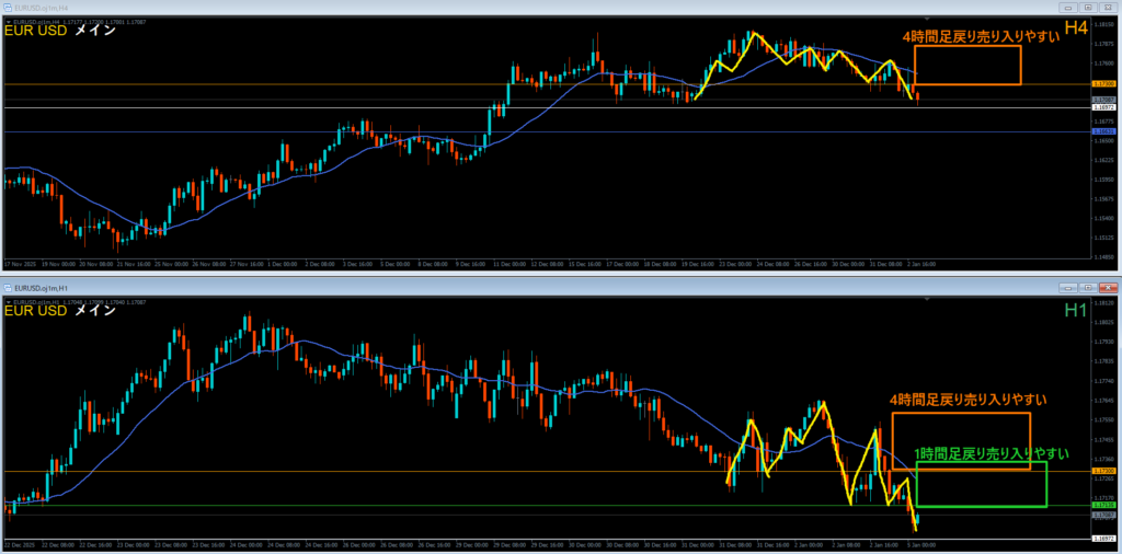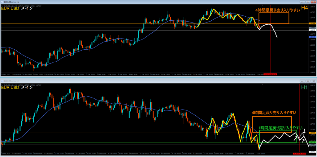 4時間戻り売りの1時間足の動きをシナリオで見ていく。