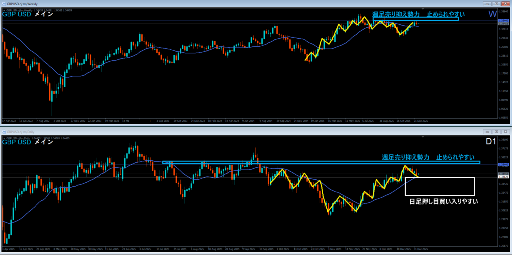 青色の水平ラインの上には週足売り抑え勢力がいる。
