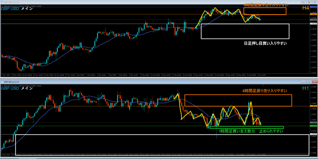 4時間戻り売りはオレンジ色のレジスタンスラインが機能していくか見ていく。