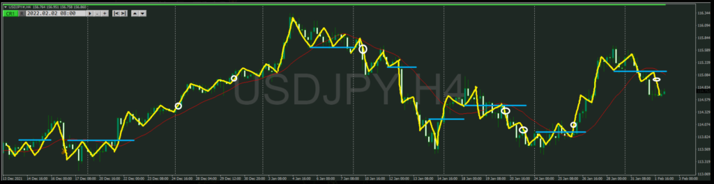 オレンジ色の❶4時間足サポートラインの下には押し目買い勢力がいる。