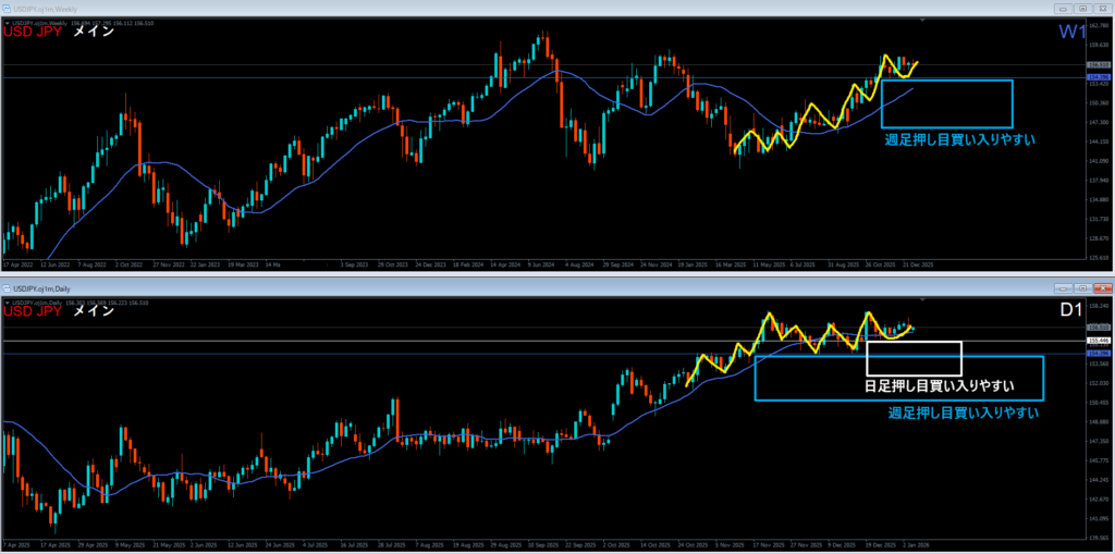 青色の週足サポートラインの下に押し目買い勢力がいる。