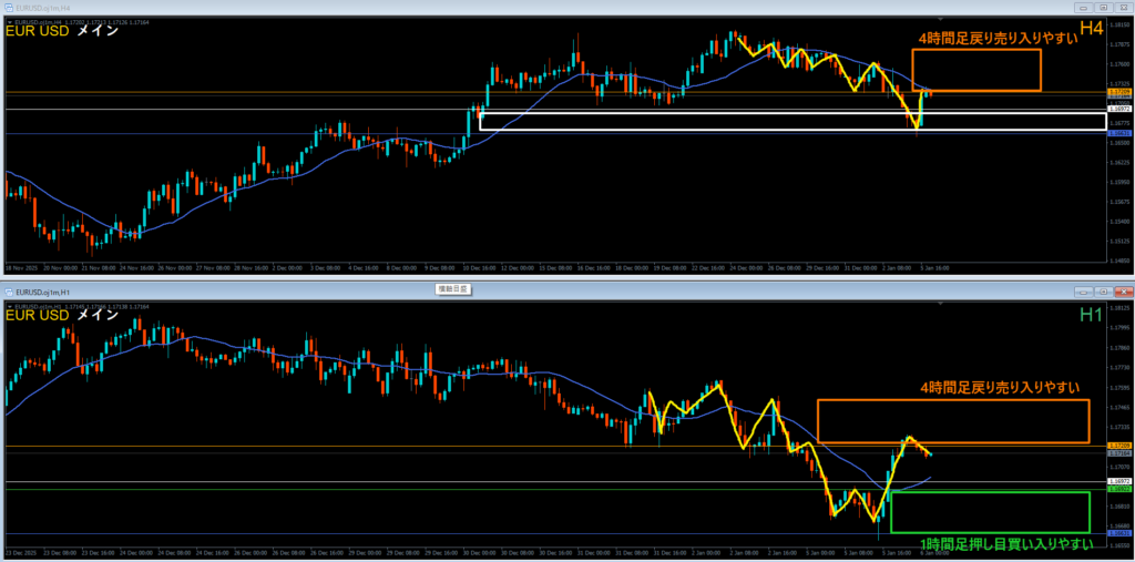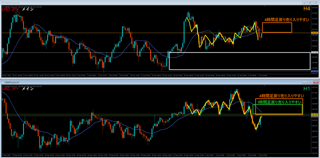 オレンジ色の4時間足レジスタンスラインの上には戻り売り勢力がいる。