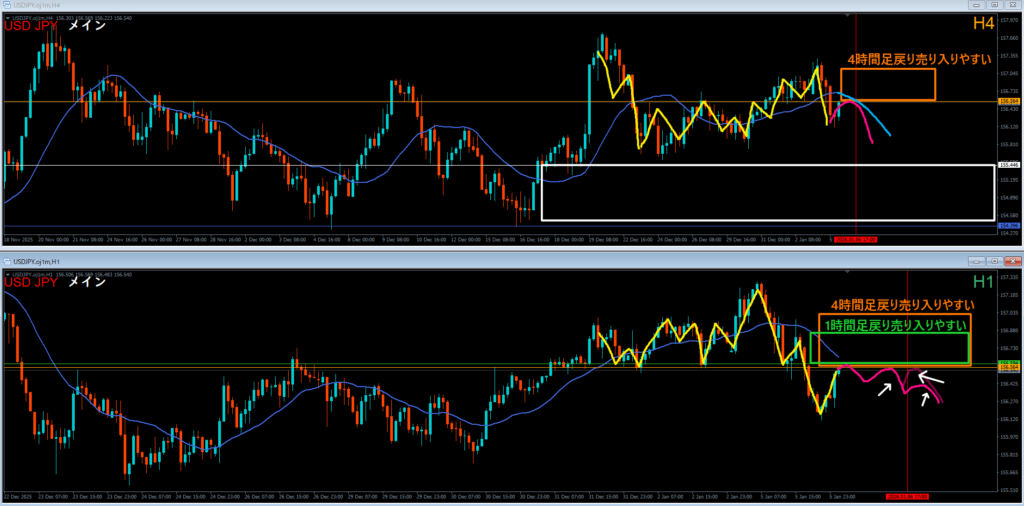 4時間戻り売りは4時間足レジスタンスラインが機能していくかみていく。