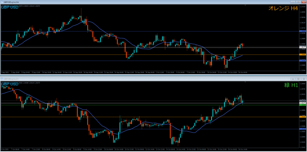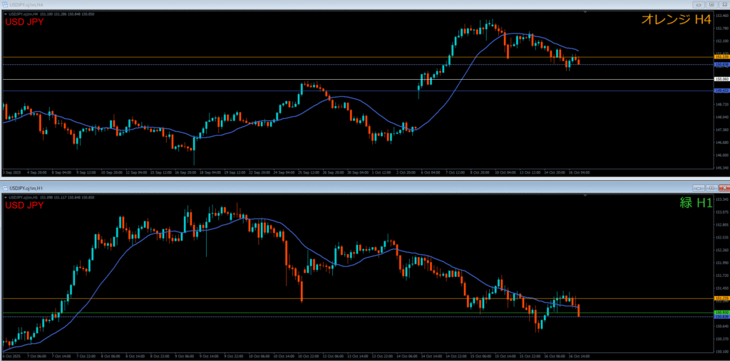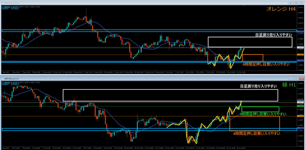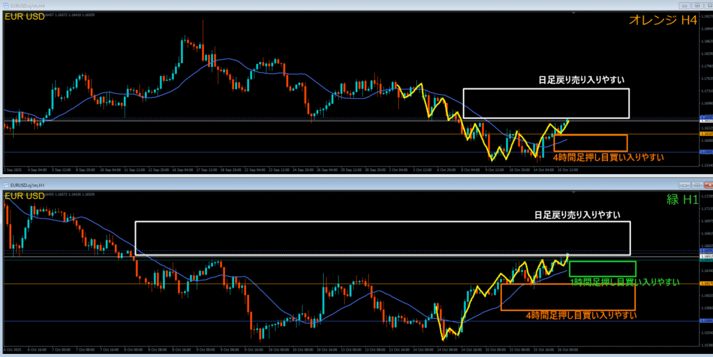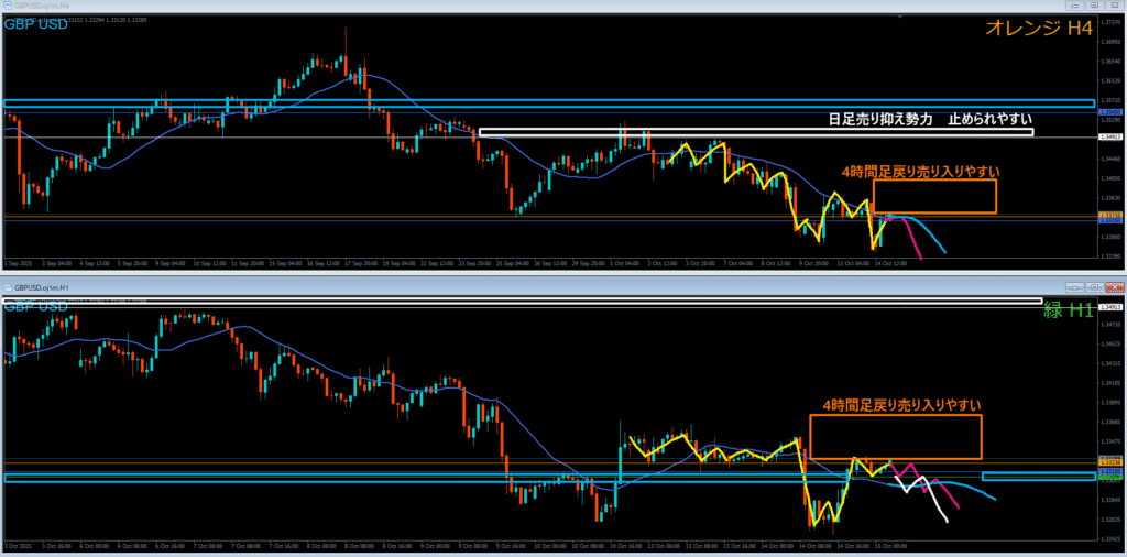 オレンジ色の4時間足レジスタンスラインの上に戻り売り勢力がいる