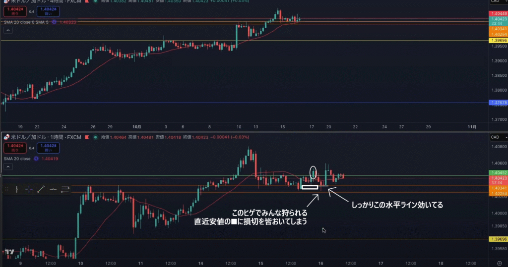 1時間直近安値に損切を置くと水平ラインはビチッと効くのだが、