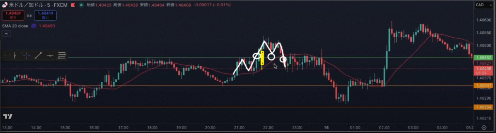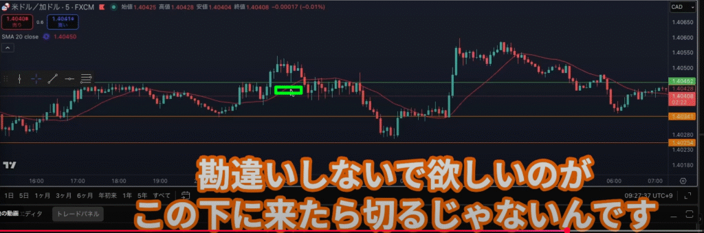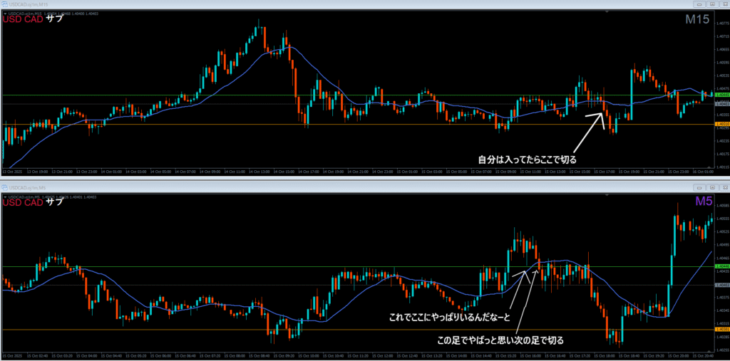5分足の安値で反応したのを見て、そこにいるんだよねって勢力があれ?抜けたぞ一旦下行っちゃうかもしれないなって思うから切る。