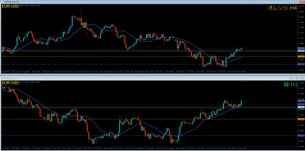 緑色の1時間足サポートラインの下には買い支え勢力がいる。