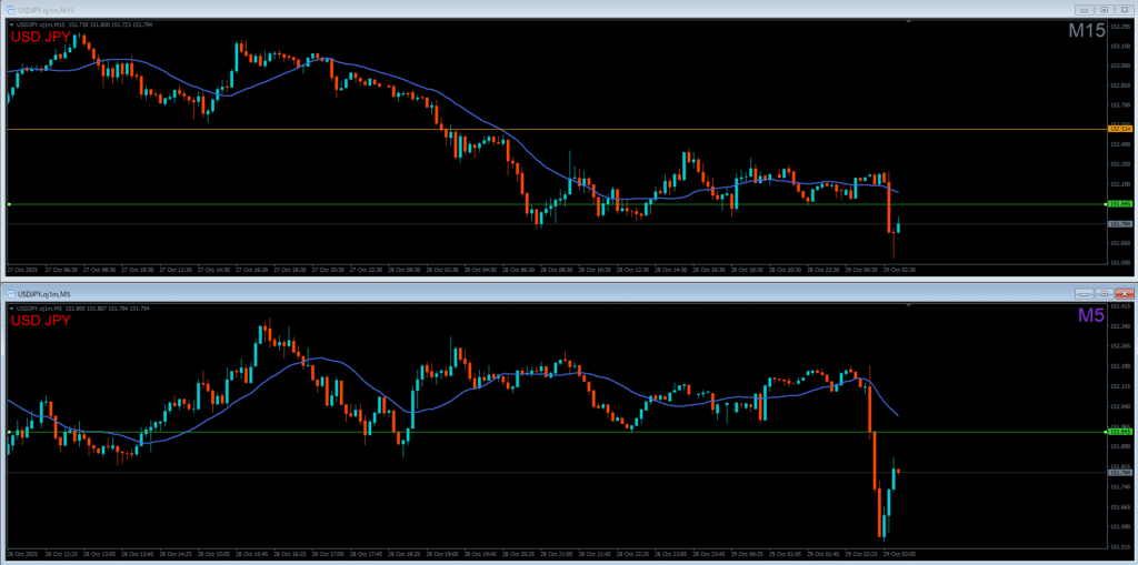 1時間足は安値を割って下落。その後押してから下落の波の途中から少し戻し。