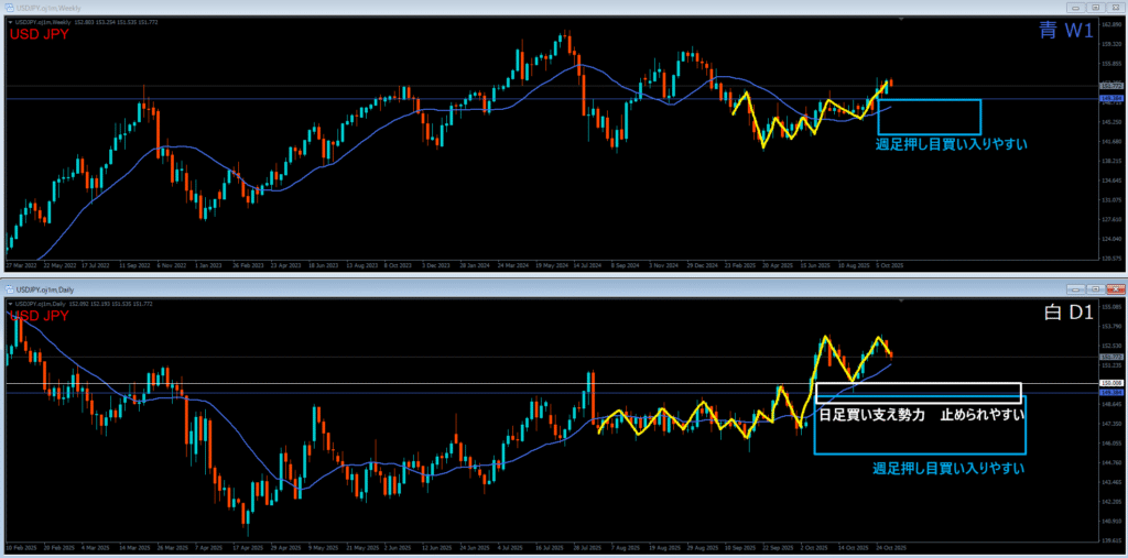 青色の週足サポートラインの下に押し目買い勢力がいる。