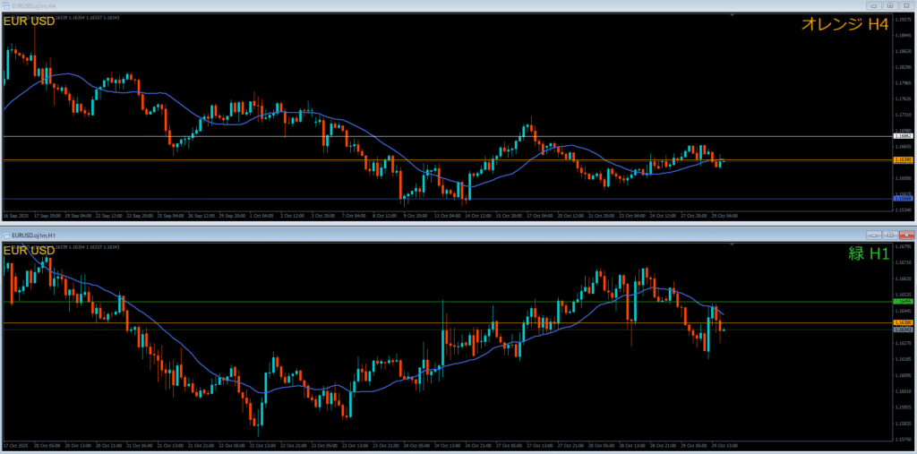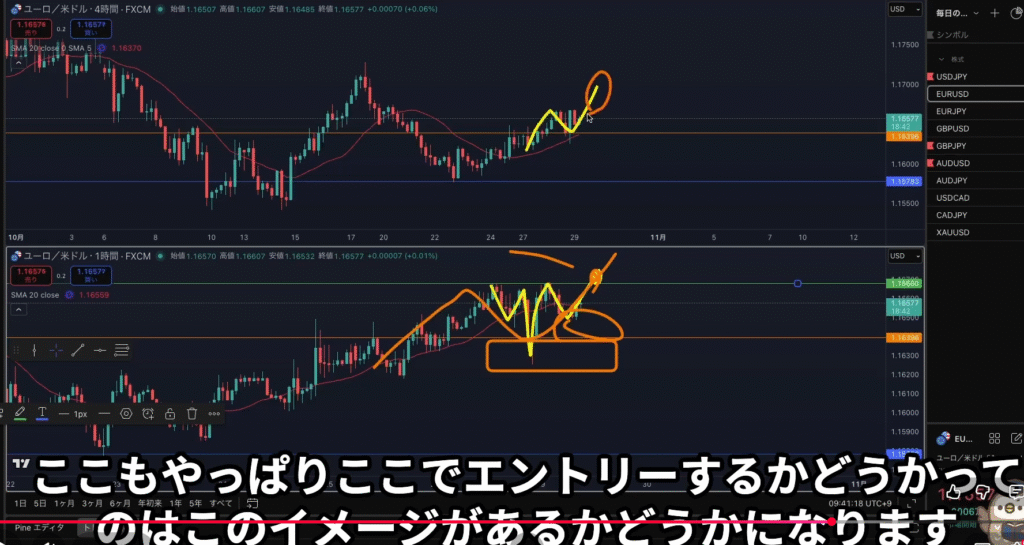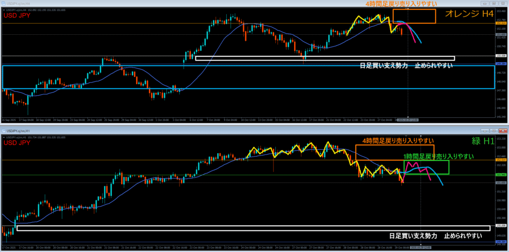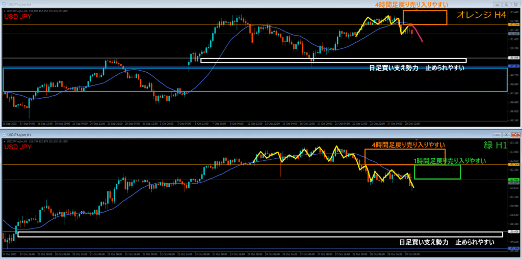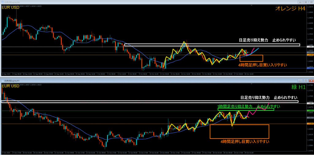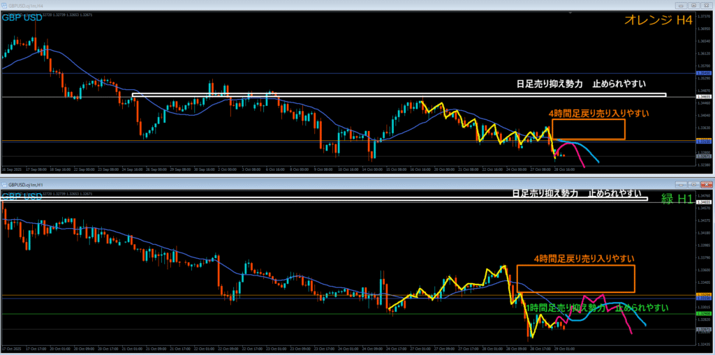 オレンジ色の4時間足レジスタンスラインの上には戻り売り勢力がいる