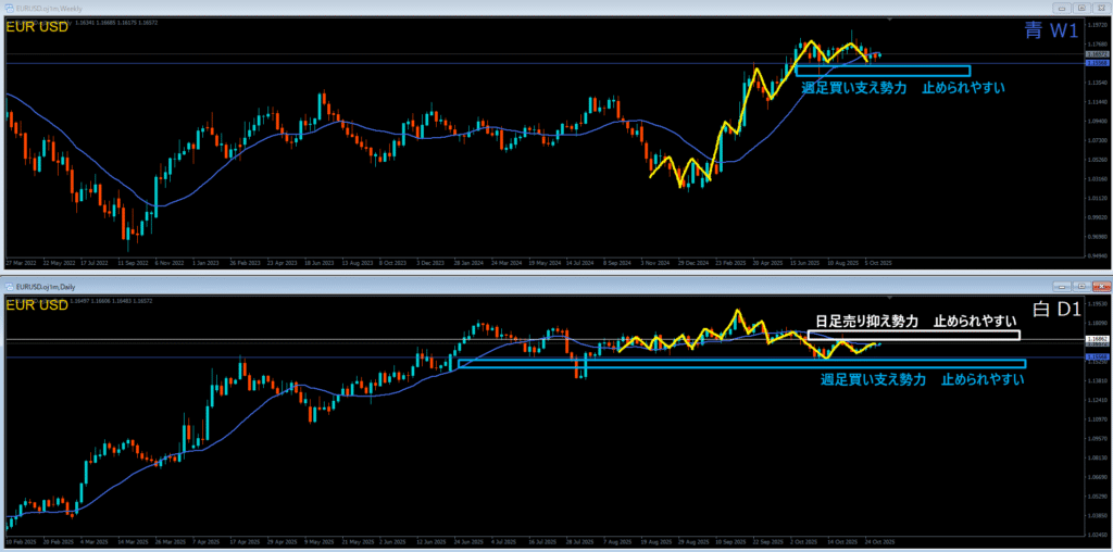 青色の❷週足サポートラインの上には買い支え勢力がいる。