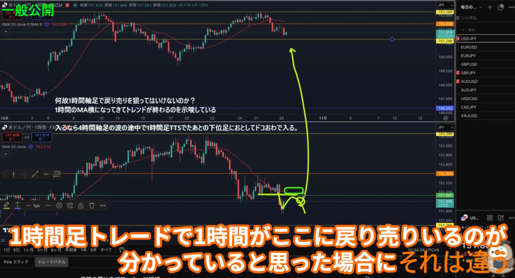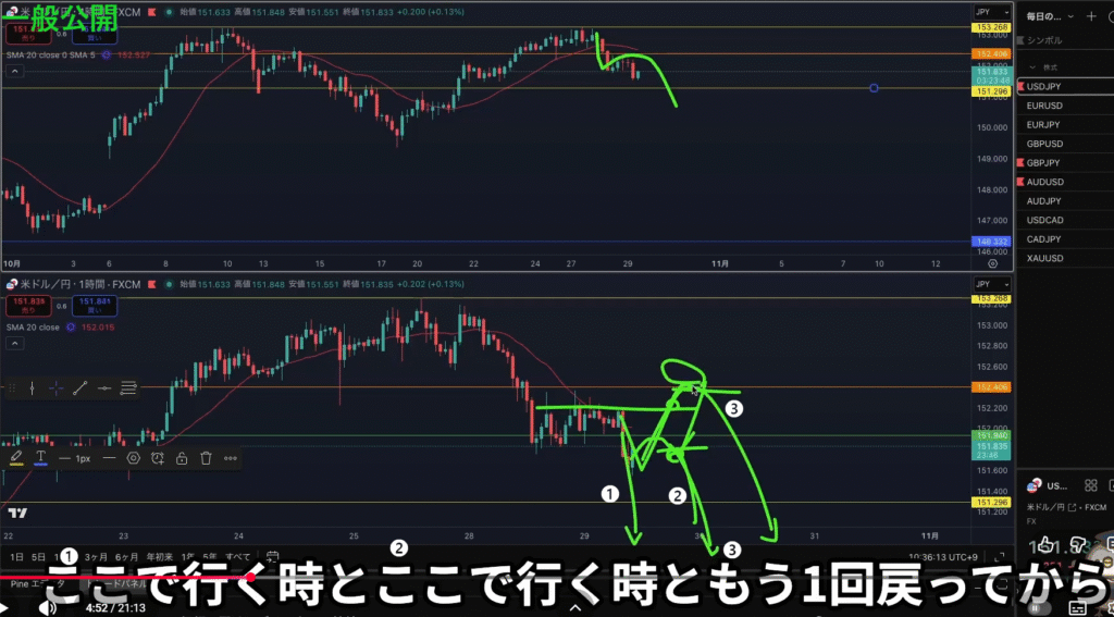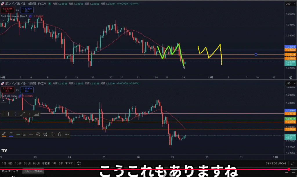 4時間足戻り売りの1時間足の動きをシナリオでいていく。