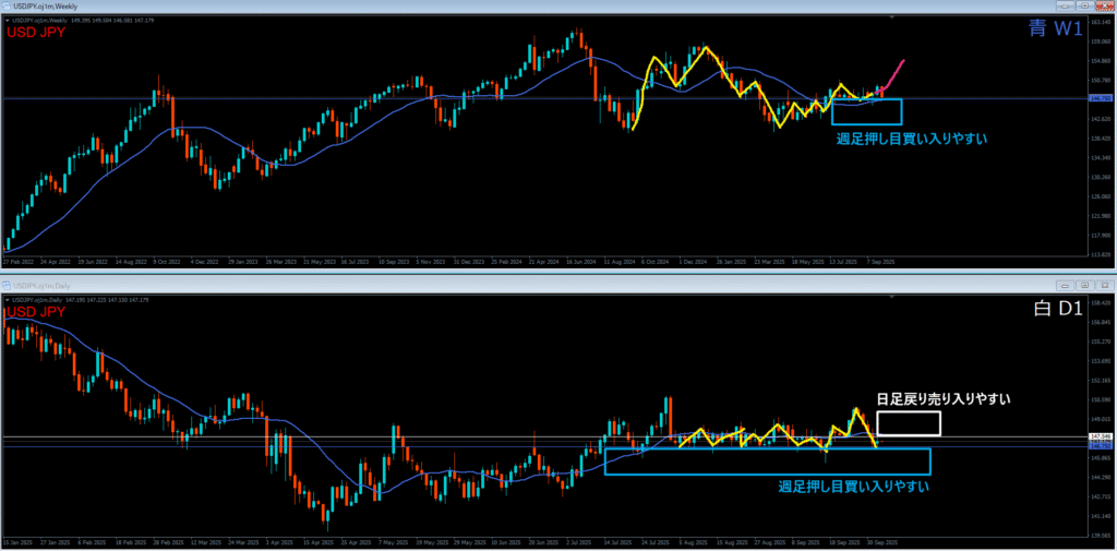 青色の週足サポートラインの下に押し目買い勢力がいる。