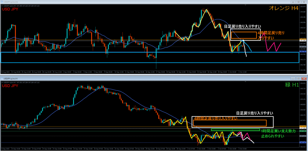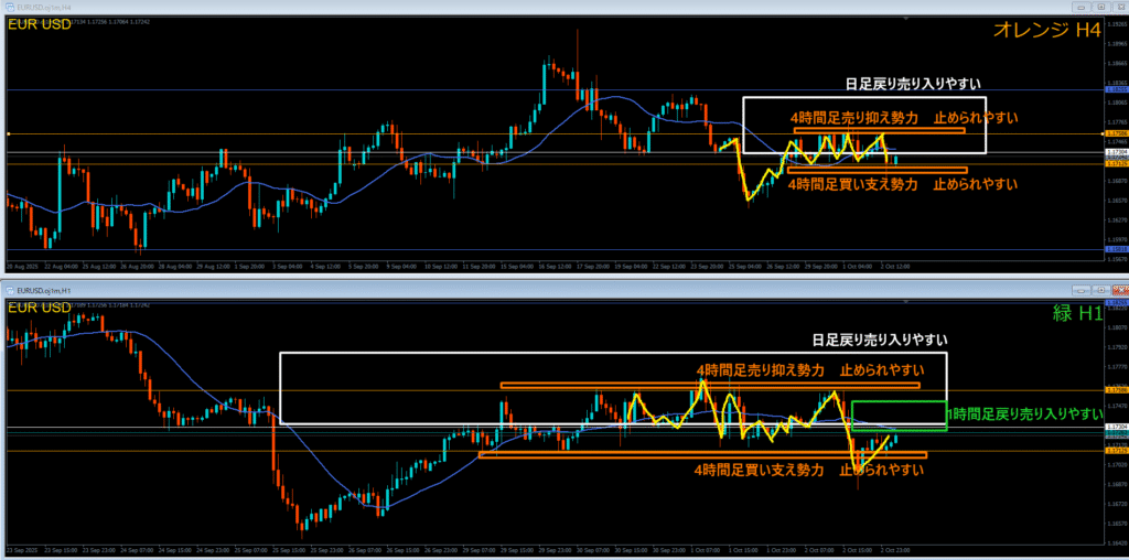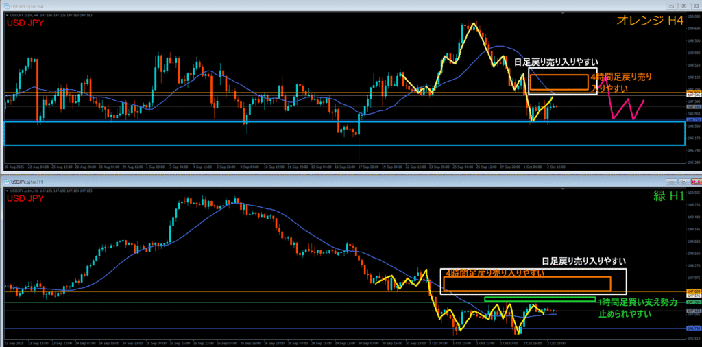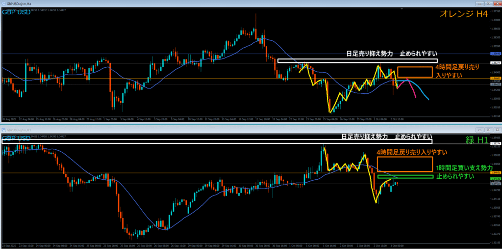 オレンジ色の4時間足レジスタンスラインの上には戻り売り勢力がいる。