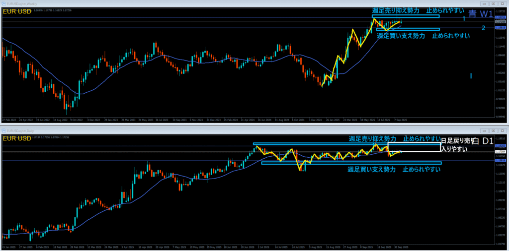 青色の週足レジスタンスラインの上には売り抑え勢力がいる。