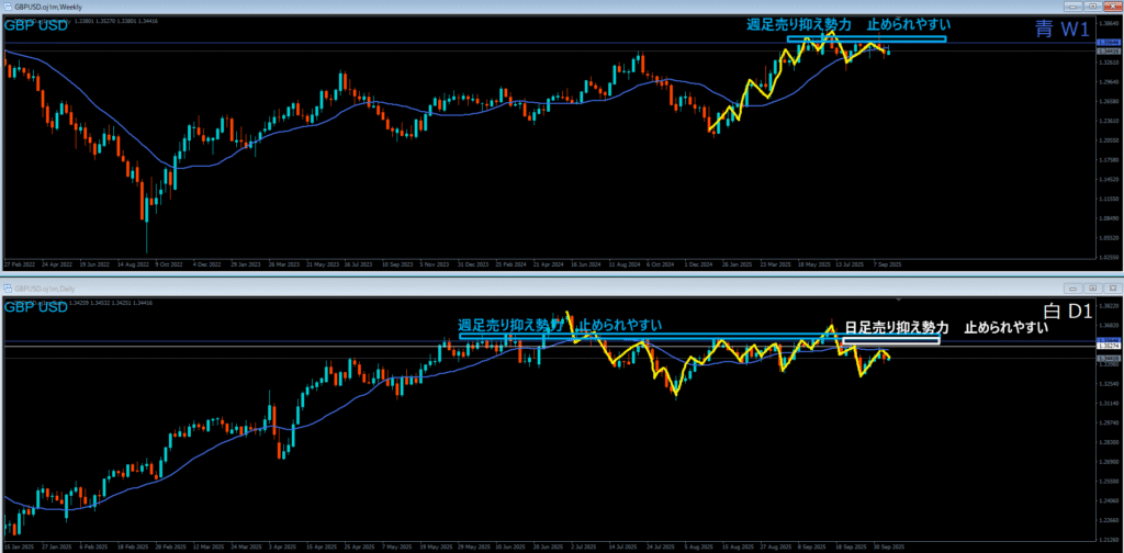 青色の❶週足レジスタンスラインの上には売り抑え勢力がいる。