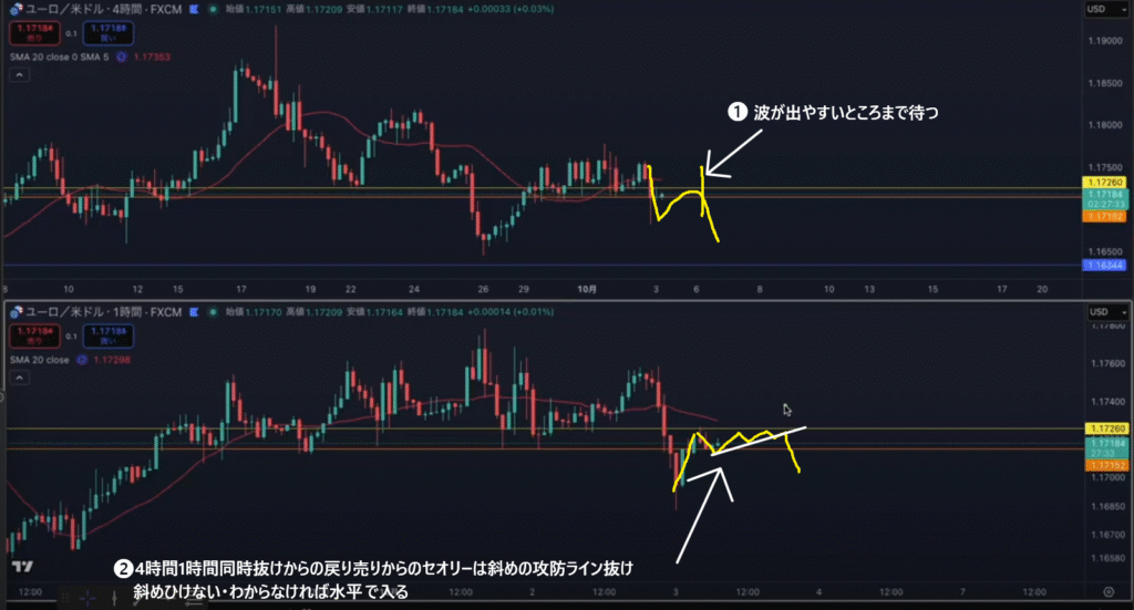 4時間戻り売りの1時間足の動きをシナリオでみていく。