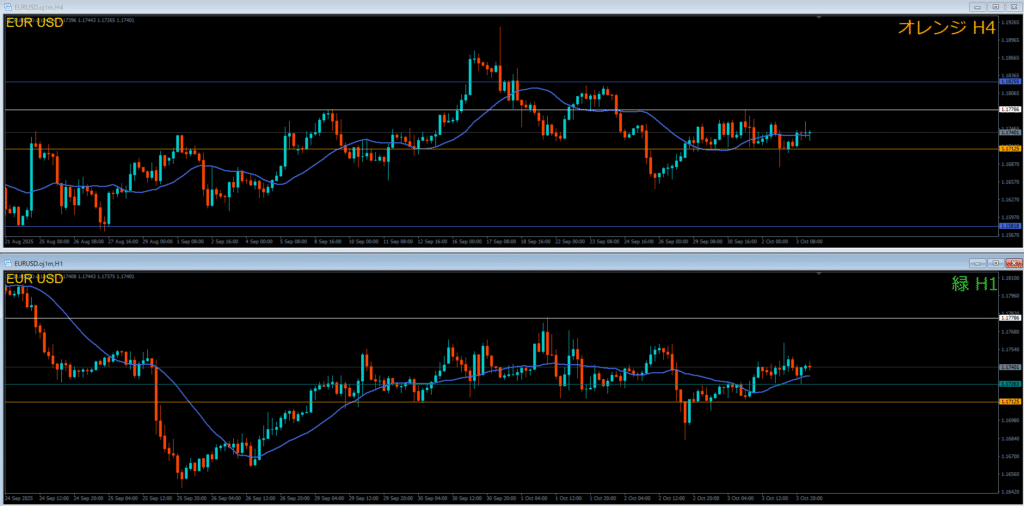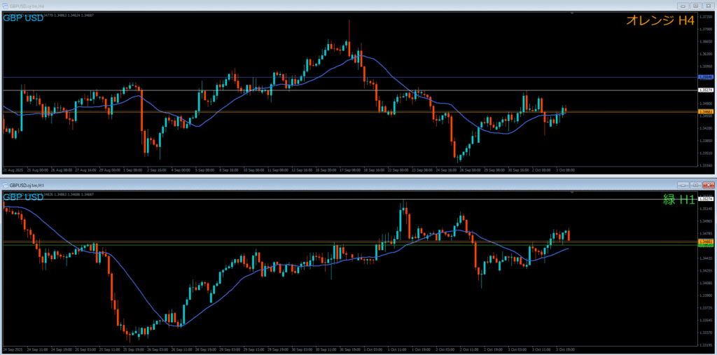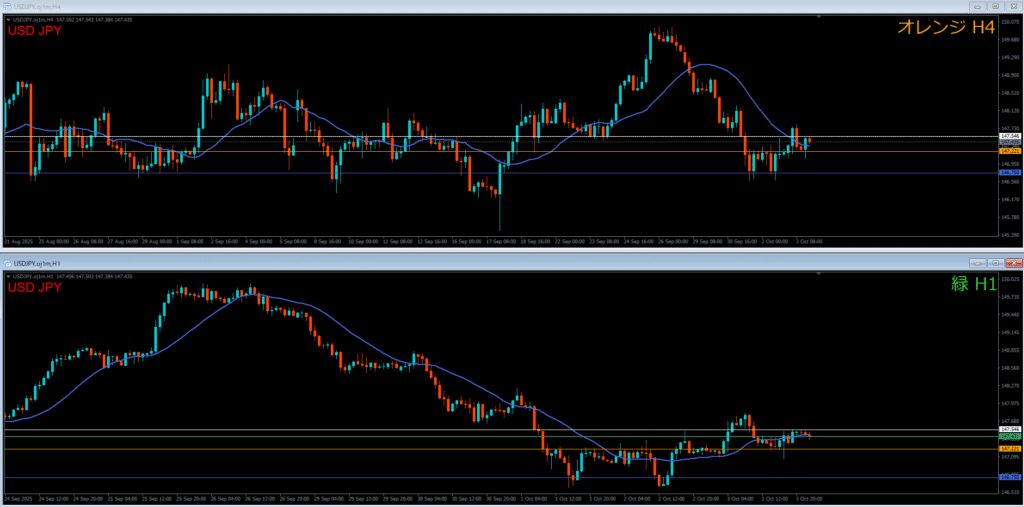 オレンジ色の各4時間レジサポラインの上下にはそれぞれ買い支え勢力、売り抑え勢力がいる。
