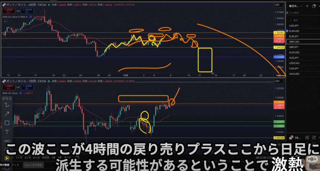 戻り売りはオレンジ色の4時間レジスタンスラインが機能していくか見ていく。