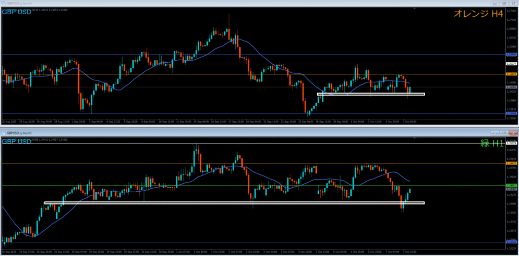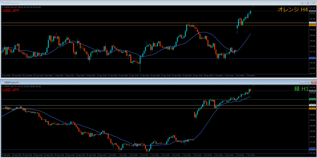オレンジ色の4時間足サポートスラインの下には買い支え勢力がいる。暫定でひいている。