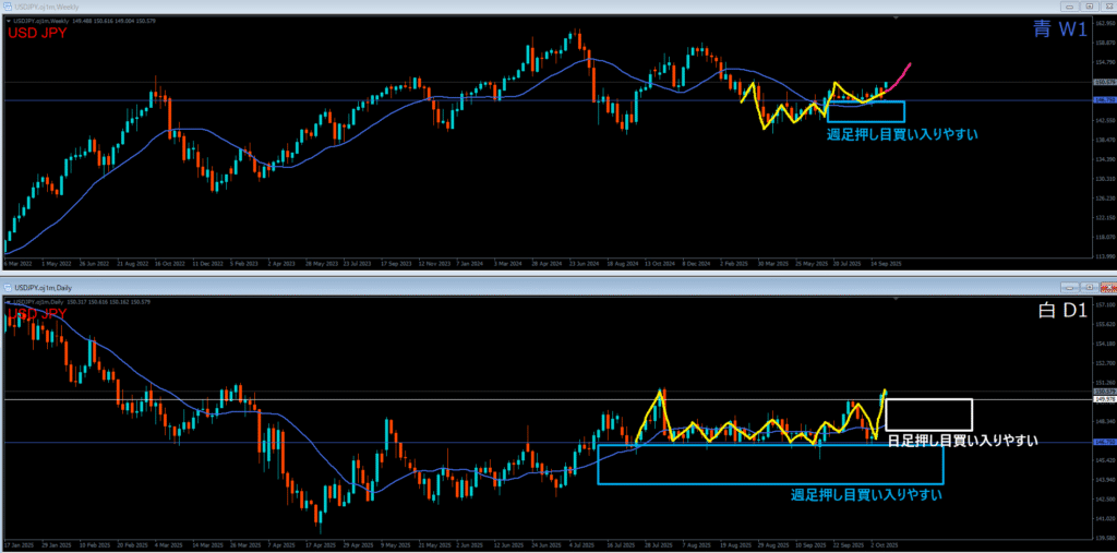青色の週足サポートラインの下に押し目買い勢力がいる。