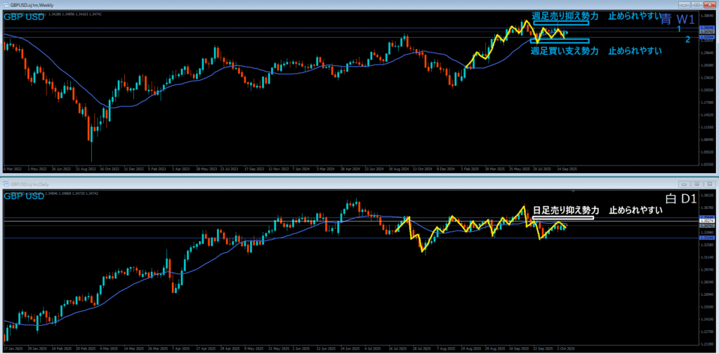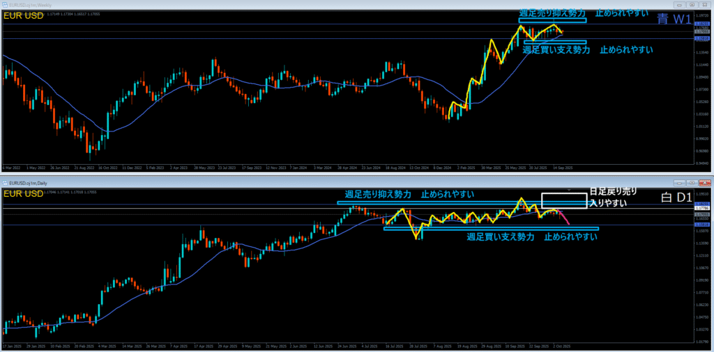 青色の❶週足レジスタンスラインの上には売り抑え勢力がいる。