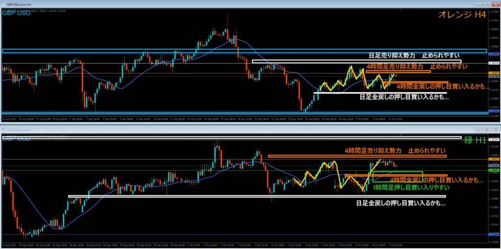 戻り売りはオレンジ色の4時間レジスタンスラインが機能していくか見ていく。